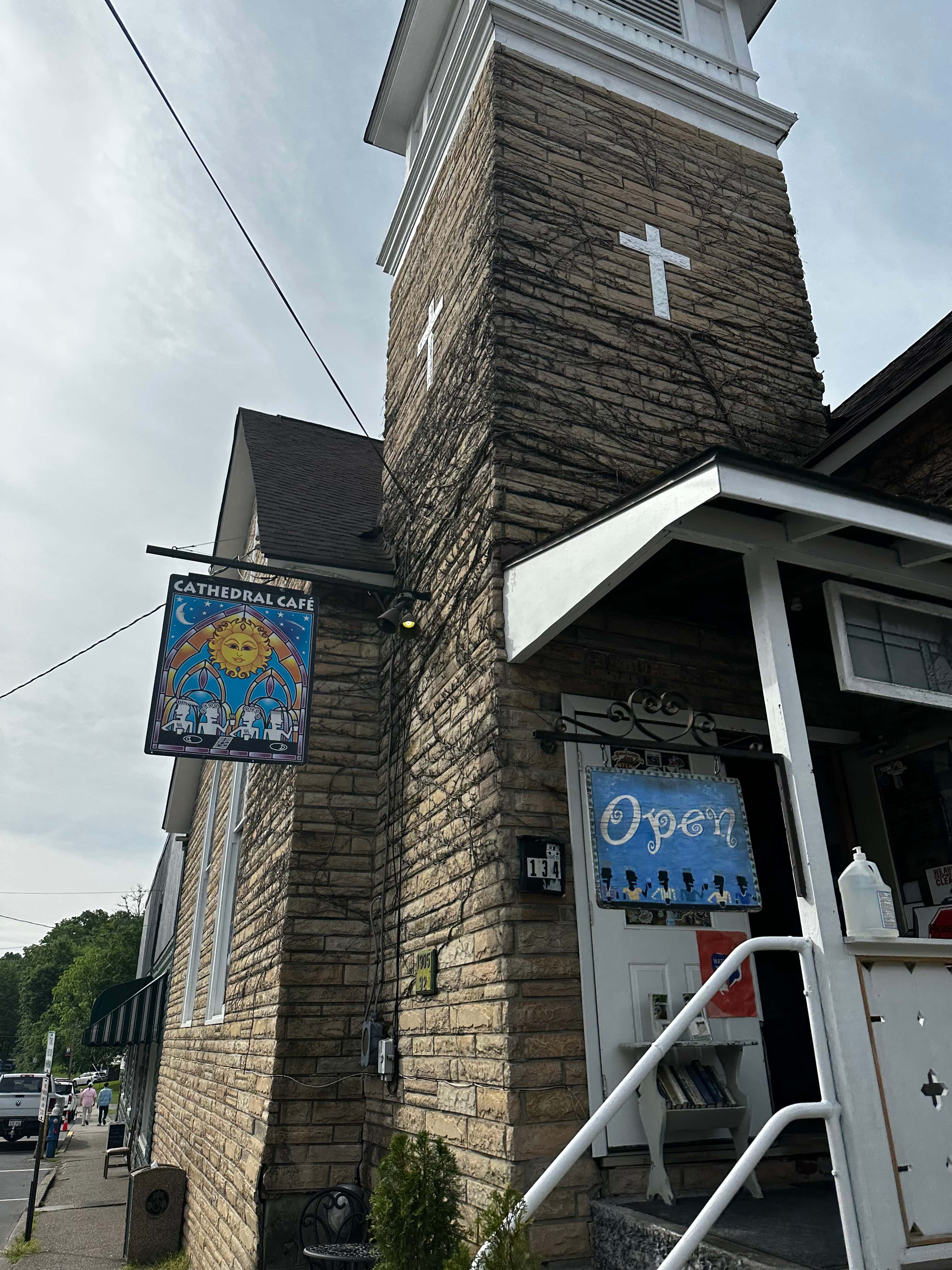Saturday morning, we had to pack up and leave. But I went out early to buy a magnet (we're going to collect them), and picked up breakfast biscuits from Tudor's Biscuit World, a WV chain, and coffee from Cathedral Cafe, which used to be a church in downtown Fayetteville.